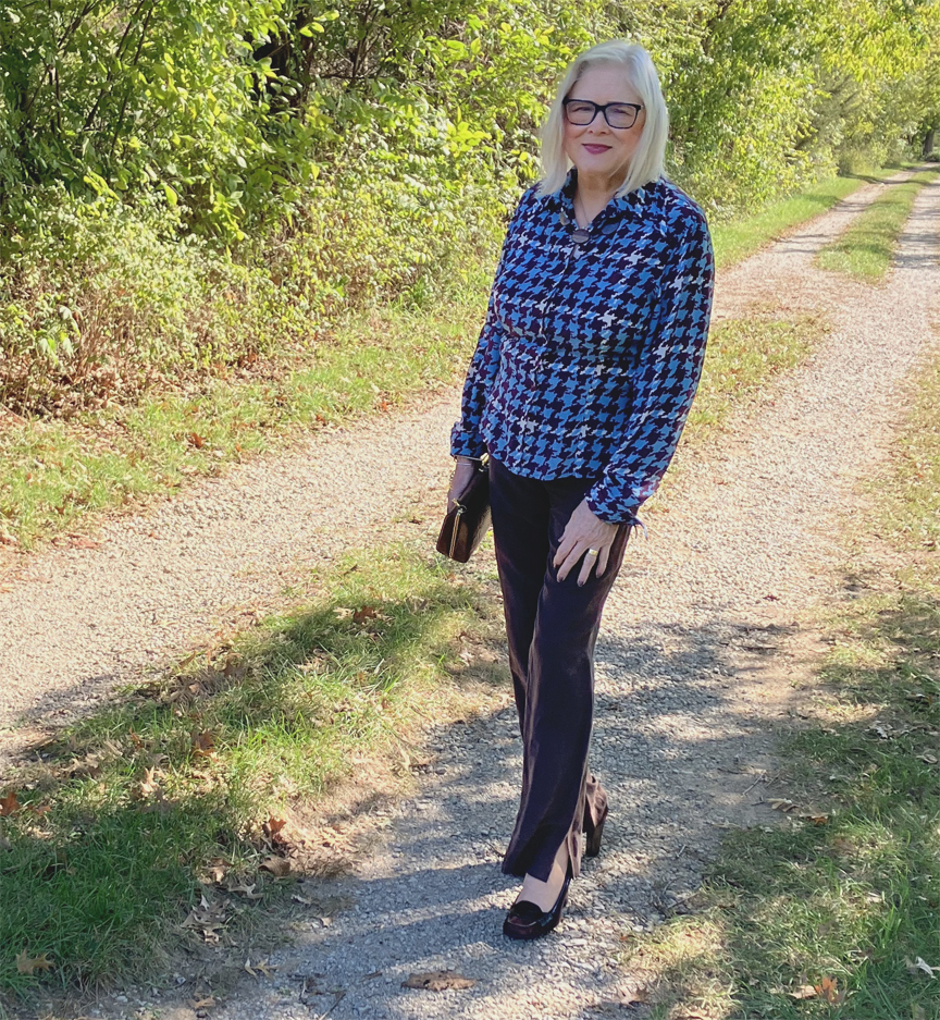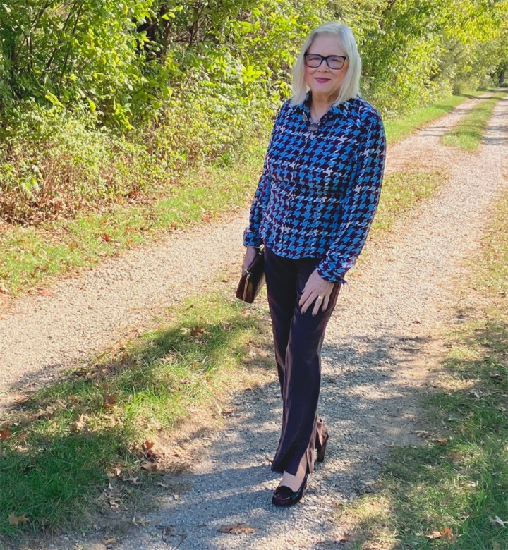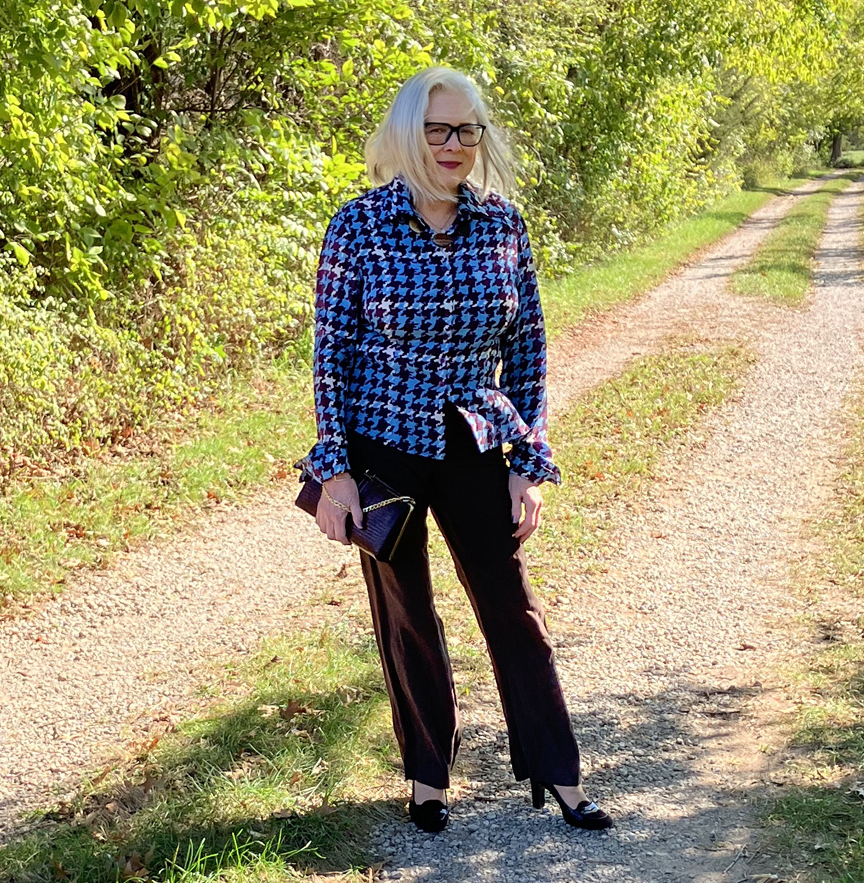 I decided to go with a blue/burgundy-brown silk blouse that I found second-hand on eBay about seven years ago. This was when I was in my “Juliana Collezione” phase of collecting. I certainly didn’t need this blouse and really don’t wear it much. However, the double collar and double cuff feature was too hard to pass up. And the way it shines in the sun! I also like the houndstooth as an interpretation of the stained glass of the wings (the brown really makes the blue stand out).