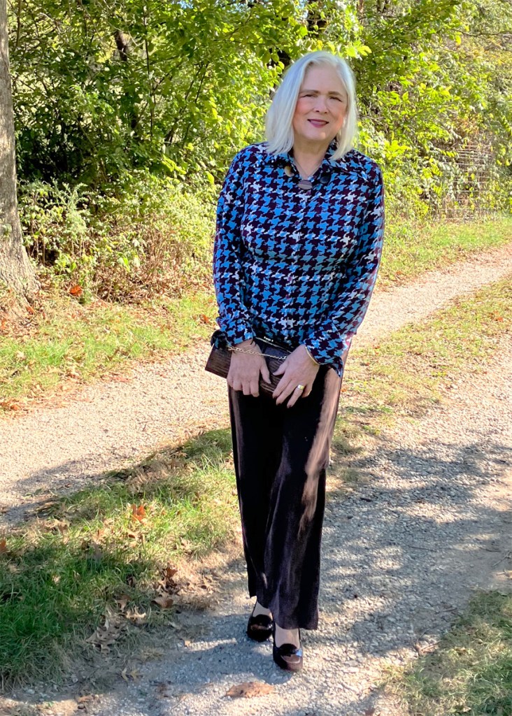 What a great top, Terri! I really like how the houndstooth print is sort of abstract and the colors are so pretty together. You and Salazar both opted for checkered prints to represent the stained glass and I think that is just a brilliant interpretation that I would have never thought of. I am a big fan of heeled loafers, too, so I am loving your shoes! Well done!