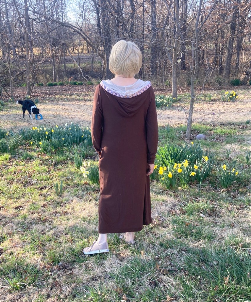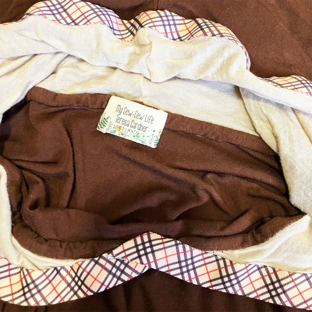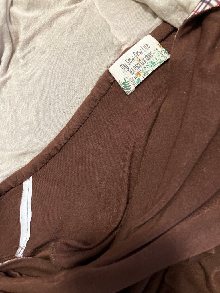 After basting my pieces, I used a four-thread overlock serged seam to sew it up. I reinforced the shoulder seams with tape. Also, I don’t like a raw serged seam around the neckline of knit cardigans or in this case, a dress with a hood. I cut a strip and attached it with a hand stitch. It gives a much nicer finish. And then, there are my tags, again from an ETSY shop.