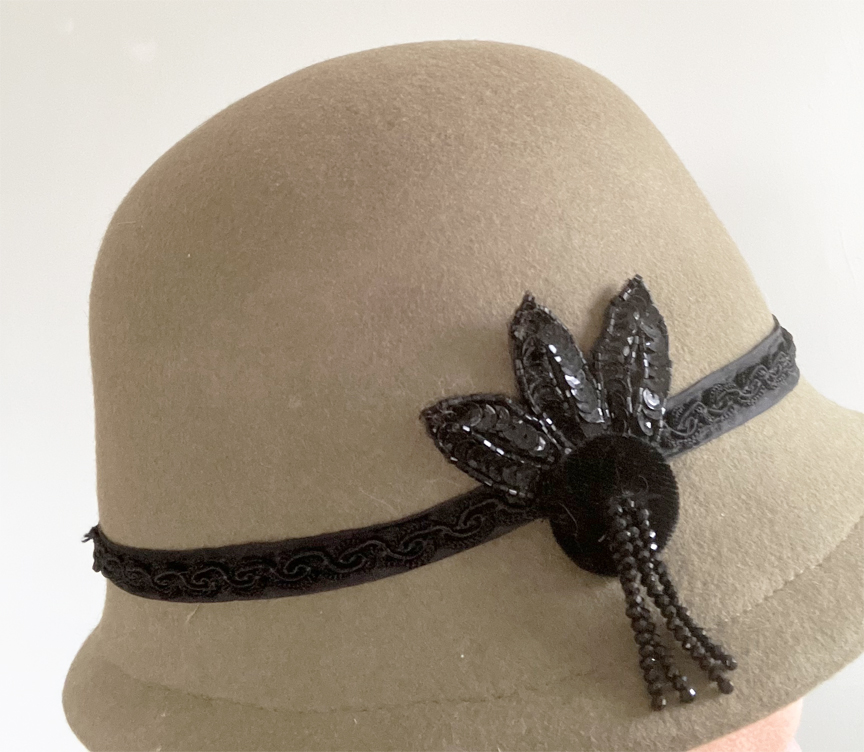 This is a makers post so I wanted to show the new hat band that I made for my old cloche. There are sequins on vintage gloves so I decided to do something that would tie the hat to them. I broke the list down when I put the hat in IG and here it is: