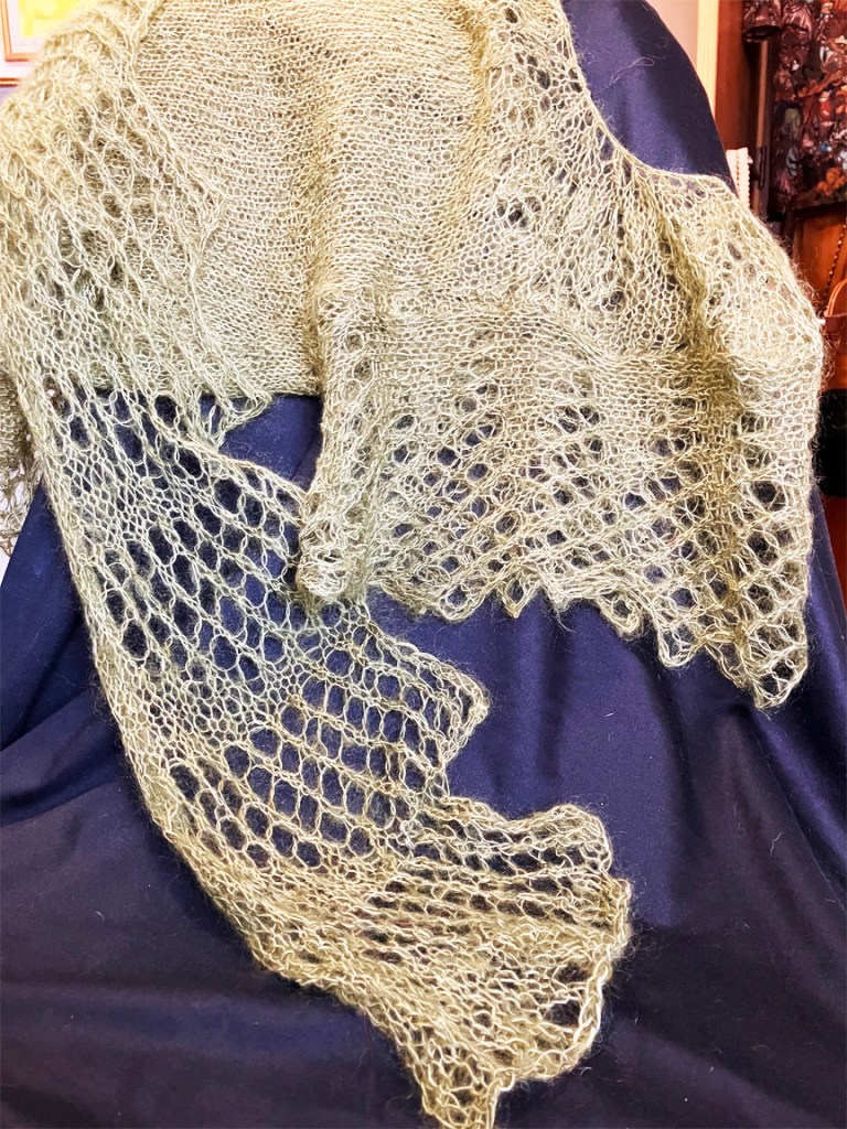 There was one other thing that sealed the deal for me. Looking on eBay for some yarn to knit it up in, there was one lot of Louet Kidlin Lace Weight in Woodland. As far as fiber content, KidLin is 49% linen, 35% kid mohair, and 19% nylon. This was the very same yarn (and color) that the designer used for the sample in the book. That was a sign! This yarn had been discontinued for a few years.