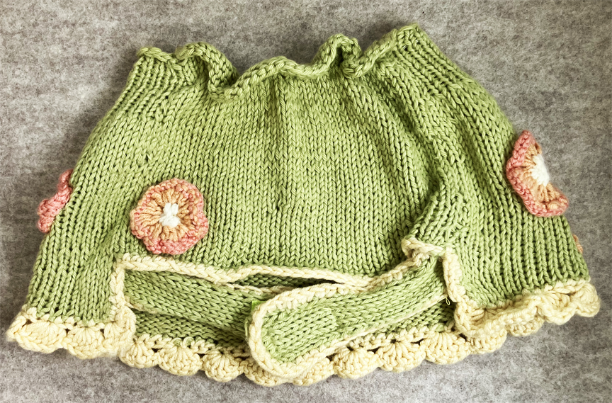Here’s a good view of the straps and the gathers created by the corded elastic. You also can see how single crochet is used around the bottom of the front. I also carried it out around the straps.