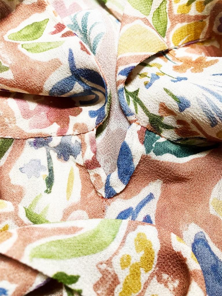 Georgette is one of the more difficult fabrics to work with. It likes to slip, slide, and fray. I took the time to hand-baste my pieces together to make life easier before sewing them on the machine. It was a slow but sure method. A light cotton or linen would work just as well and might be easier to work with.