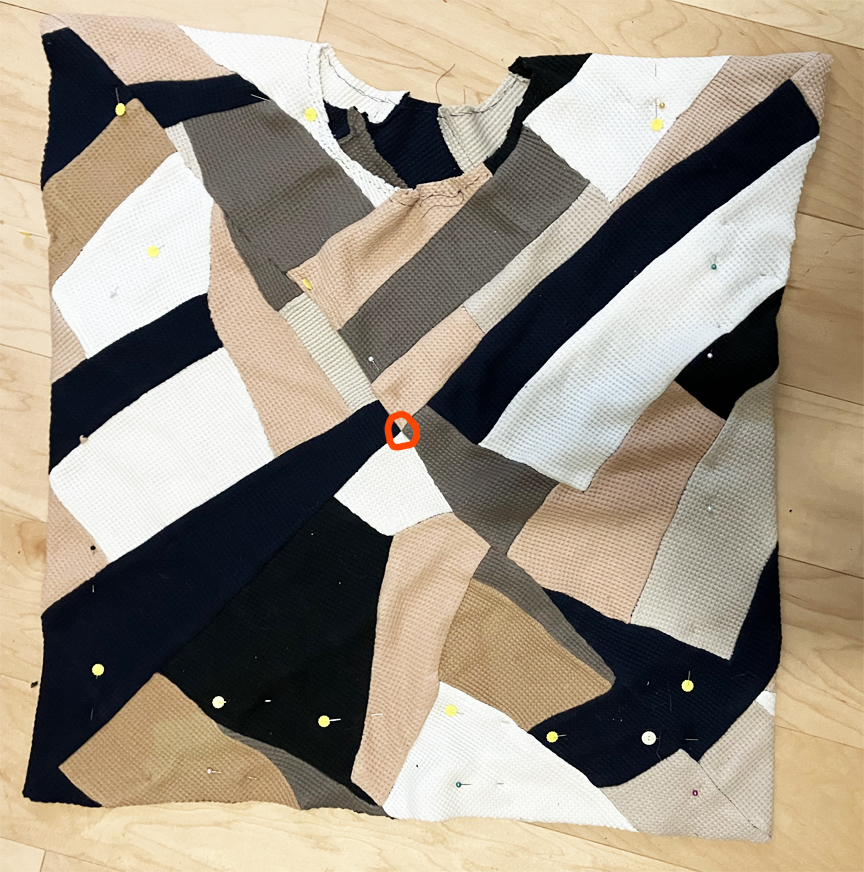 The red circle shows where all four corners meet in the center front of the Xanthea. After making the envelope and using the template to cut out the neck, the next step is cutting the bottom and armholes open.