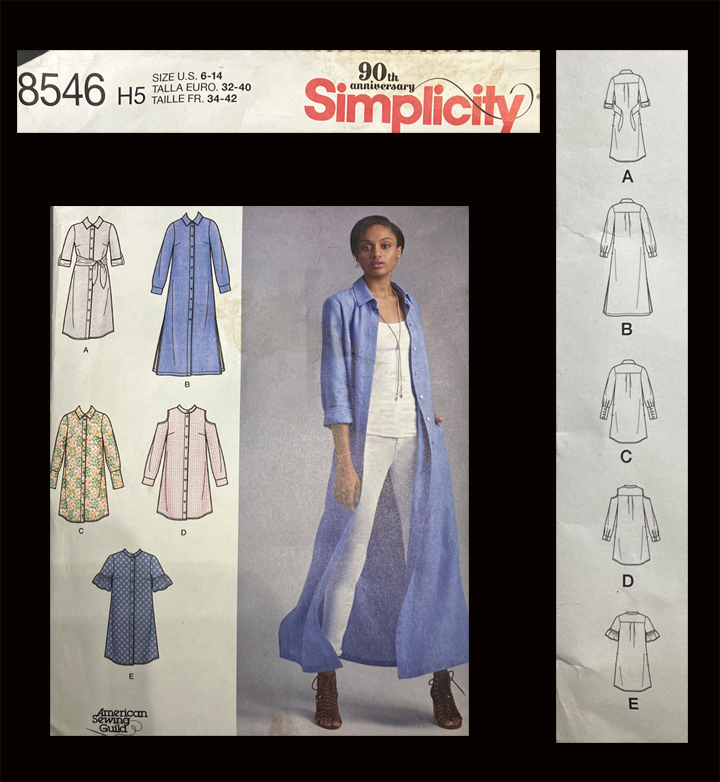 Simplicity 8546 is a simple classic shirt that has been lengthened for View B as a duster. It offers a few variations to choose from. All but B are dresses. This may have been the cause of the problems. As this is a shirt/dress pattern, it (IMO) did not have enough ease figured into the original pattern to accommodate wearing it comfortably over other layers. At least, there wasn’t enough for my daughter. My problem-solving was how to fix this.